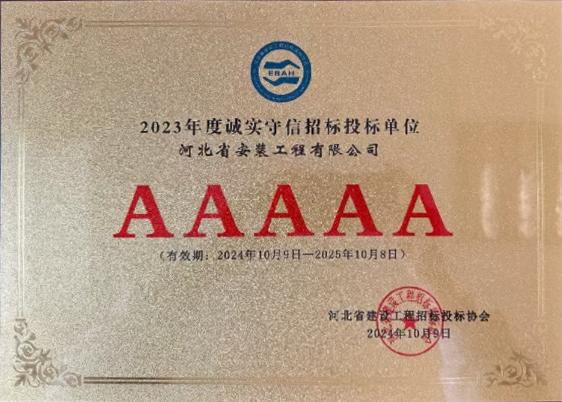近日,公司獲得“2023年度河北省建設工程招標投標誠實守信5A級施工企業”榮譽稱號。公司連續16年獲此殊榮,以自身優良市場行為為協會其他會員單位做出表率。
