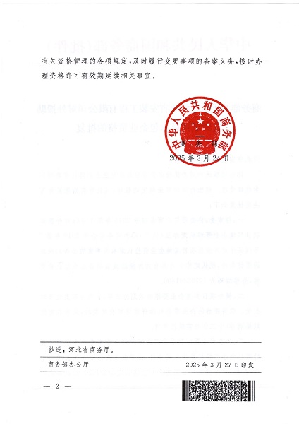 在公司國際化戰略的引領下,在公司領導的精準指導下,海外市場部攜手綜合辦公室、財務管理部、人力資源部等相關部門,歷經四個月的不懈努力,緊密協作,先后順利通過河北省商務廳的初步審核以及商務部的嚴格復核,成功斬獲對外援助成套項目總承包企業資格。這一重大突破,標志著公司在國際援助領域踏出堅實有力的一步,為加速“走出去”進程、拓展海外經營模式、開辟全新海外市場注入強勁動力。該資格的獲取,充分彰顯公司已具備獨立承接中國政府對外援助成套項目實施任務的雄厚實力。